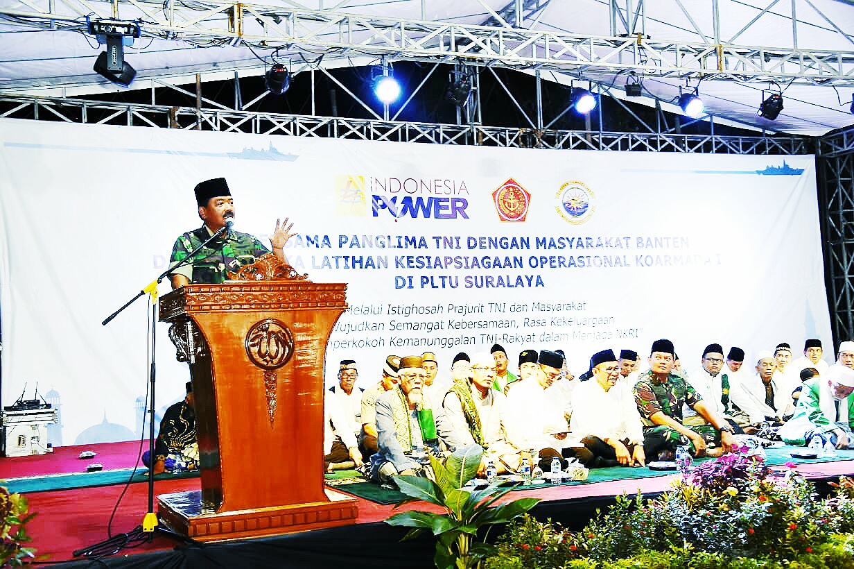 Demikian dikatakanPanglima TNI, Marsekal TNI Hadi Tjahjanto, S.I.P. pada acara Doa Bersama Panglima TNI dengan masyarakat Banten dalam rangka Latihan Kesiapsiagaan Operasional Koarmada I di PLTU Suralaya, dengan tema “Melalui Istighosah Prajurit TNI dan Masyarakat Kita Wujudkan Semangat Kebersamaan, Rasa Kekeluargaan serta Memperkokoh Kemanunggalan TNI-Rakyat Dalam Menjaga NKRI”, bertempat di Eco Park PT. Indonesia Power, Suralaya Cilegon, Provinsi Banten, Rabu malam (27/3/2019).