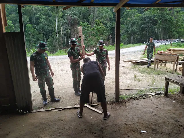 Pos Km 76 dipimpin Sertu Khamdi bersama 5 orang anggota melaksanakan karya bakti membantu merenovasi rumah salah satu warga binaan Pos km 76 Distrik Mannem, Kabupaten Keerom, Provinsi Papua. Rabu (22/01/2020)