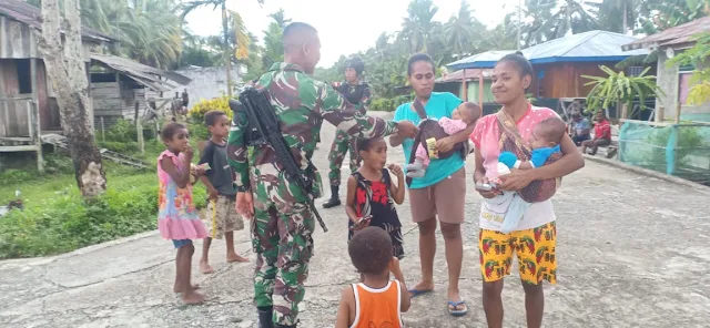 Keerom, nusantarabicara.co - Sebagai Upaya untuk mendekatkan diri dan memupuk rasa persaudaraan kepada masyarakat perbatasan, kali ini Satgas Pamtas Yonif Raider 509 Kostrad Pos Kotis melaksanakan anjangsana sekaligus berbagi snack/makanan ringan kepada anak-anak sekitar di Kampung Warlef, Distrik Senggi Kabupaten Keerom, Papua. Selasa (21/1).