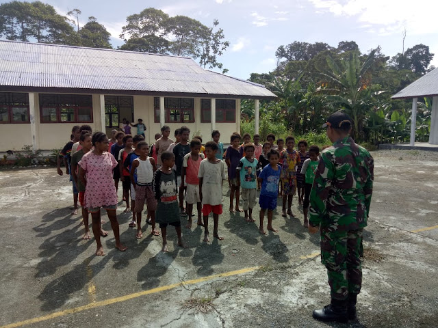 Papua, nusantarabicara.co - Menjadikan pribadi yang disiplin baik secara perorangan maupun dalam bentuk kelompok, Satuan Tugas (Satgas) Yonif Raider 509 Kostrad yang berada di Pos Bompay pimpinan Sertu Yoko memberikan latihan Peraturan Baris-Berbaris (PBB) kepada murid-murid SD Inpres Bompay, Kp.Bompay Distrik Waris, Kabupaten Keerom, Papua. Senin (24/2).
