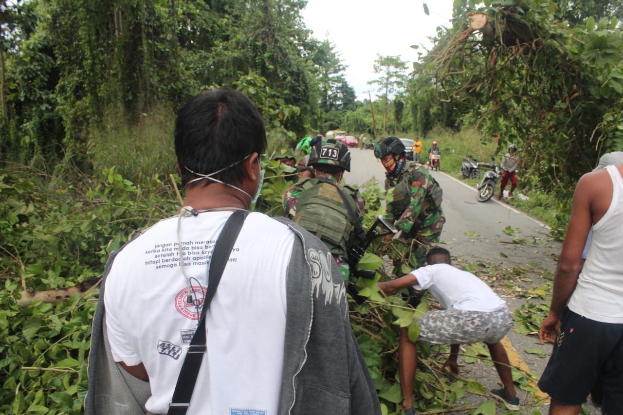 Satgas Yonif 713/Satya Tama yang kebetulan melintasi jalan tersebut dibantu dengan masyarakat setempat berusaha mengevakuasi dan menyingkirkan pohon tersebut dengan menggunakan alat seadanya sehingga jalanan bisa di lalui kembali dan kegiatan ini sendiri memakan waktu kurang lebih setengah jam atau 30 menit.