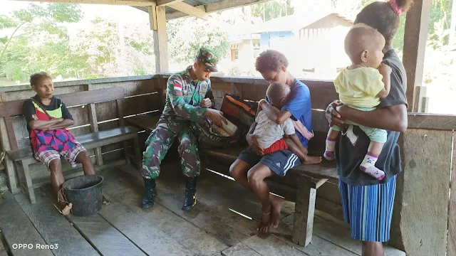 Papua, nusantarabicara.co - Masyarakat kampung Kibay yang terletak di ujung timur Distrik Arso Timur Kab. Keeroom Kota Jayapura Provinsi Papua yang merupakan wilayah penugasan Satgas Yonif 713/ST mendapatkan pengobatan gratis dari personil tim Kesehatan Pos Kaliasin. Jumat (05/06/2020)