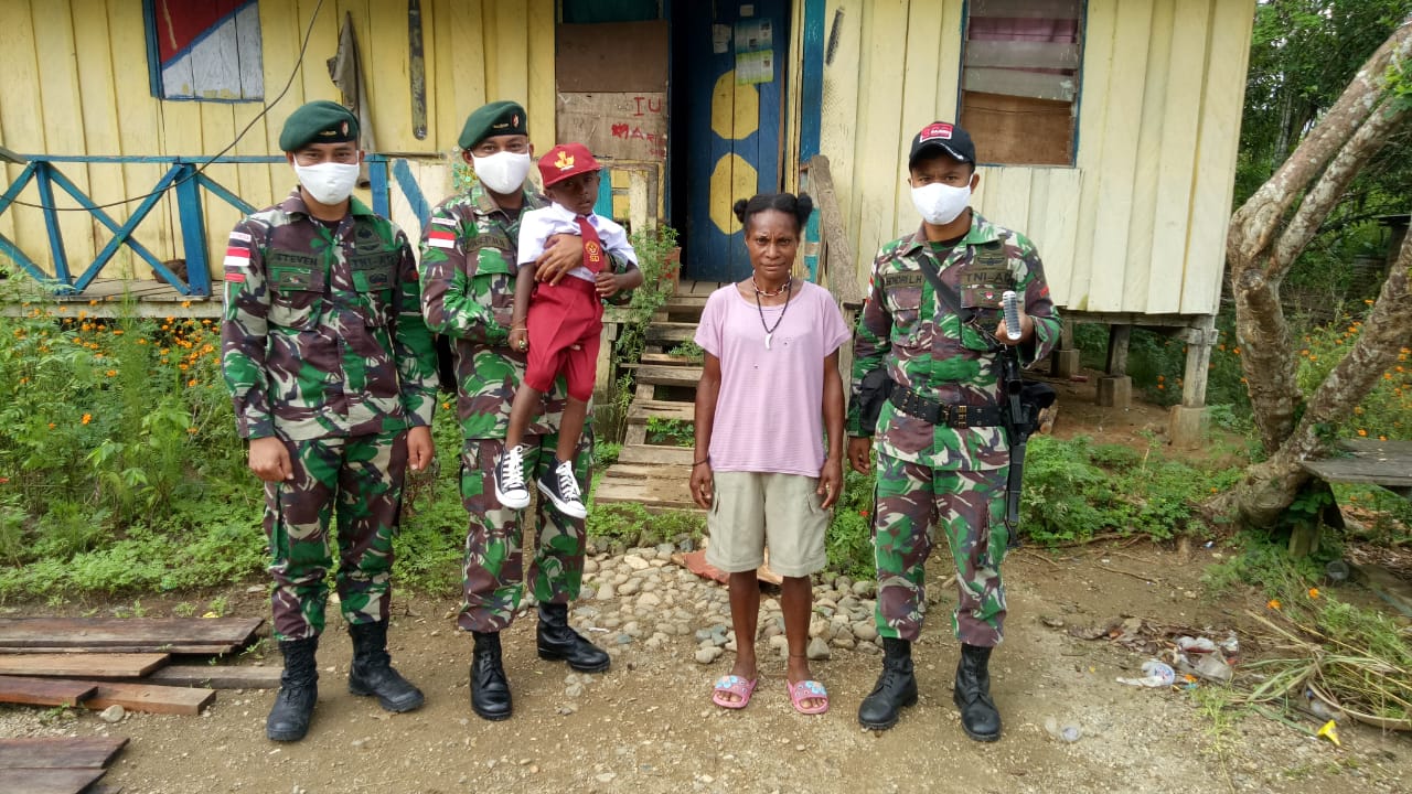 Papua, nusantarabicara.co - Satgas Pamtas Yonif Raider 300/Bjw, Pos Yabanda yang dipimpin Letda Inf Asep Nana melaksanakan kegiatan memberikan bantuan seragam, sepatu sekolah dan alat olah raga untuk siswa SD Inpres Yabanda, Distrik Yaffi.