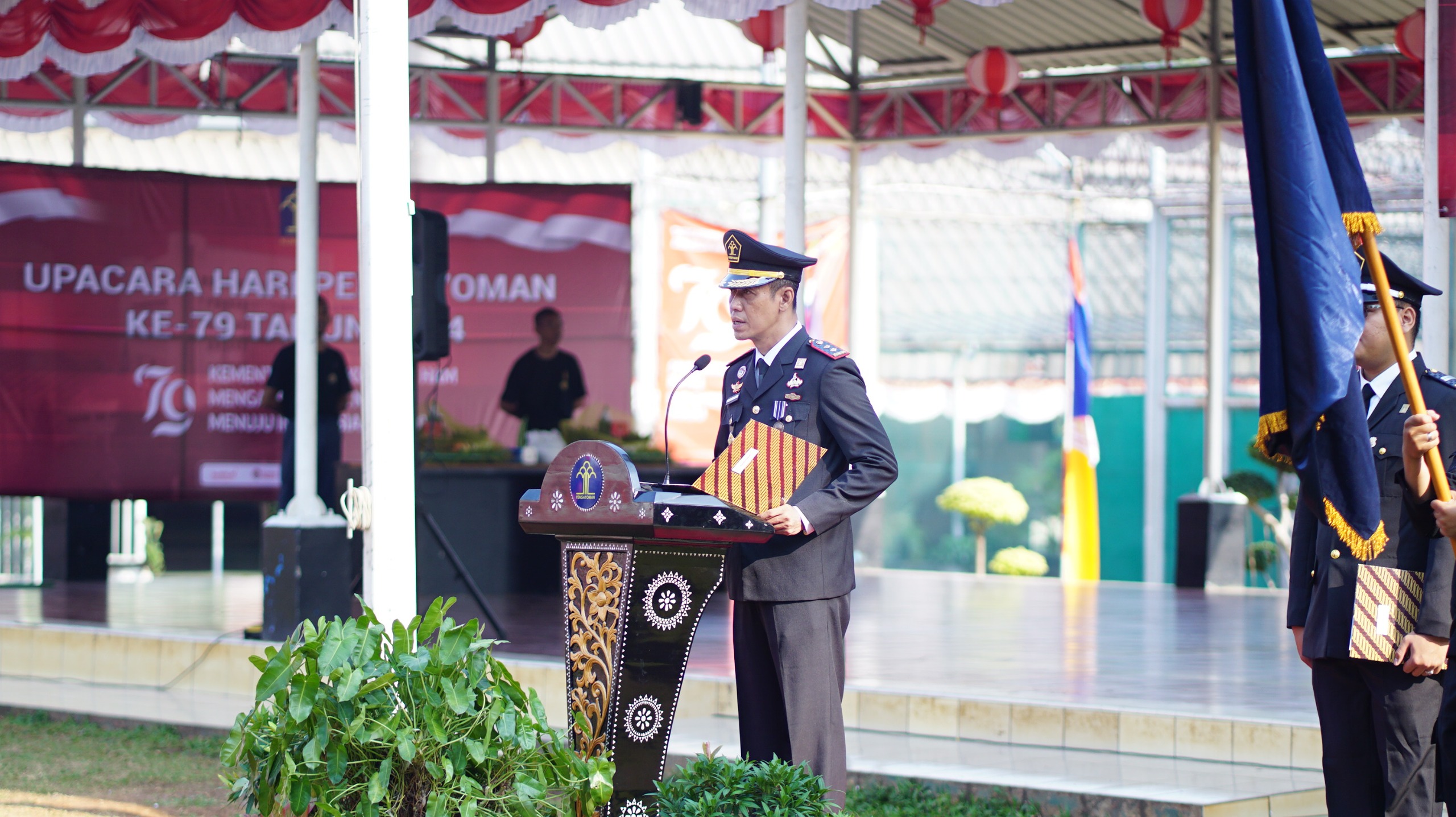 Kepala Rutan Kelas I Cipinang, Sukarno Ali yang memimpin upacara dalam peringatan Hari Pengayoman ke-79 membacakan sambutan dari Menteri Hukum dan Hak Asasi Manusia Republik Indonesia, yang menyoroti pentingnya semangat pengabdian dan peran Kemenkumham dalam mewujudkan visi Indonesia Emas 2045.